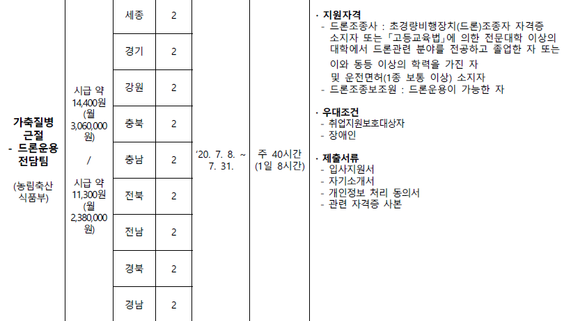 -지원자격 : 드론조종사 : 초경량비행장치(드론)조종자 자격증 소지자 또는 「고등교육법」에 의한 전문대학 이상의 대학에서 드론관련 분야를 전공하고 졸업한 자 또는 이와 동등 이상의 학력을 가진 자 및 운전면허(1종 보통 이상) 소지자