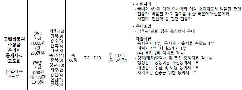-지원자격 : 국내외 4년제 대학 학사학위 이상 소지자로서 박물관 관련 전공자, 박물관 자료 검토를 위한 국문학과한문학과, 사진학, 전산학 등 관련 전공자
