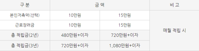 처음에 통장을 개설 할 때 10만원과 15만원 중에서 선택을 할 수 있고, 2년과 3년에 따라서 아래와 같이 받을 수 있는 금액이 정해집니다.