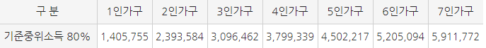 2020년의 기준중위소득 80%는 아래와 같습니다.