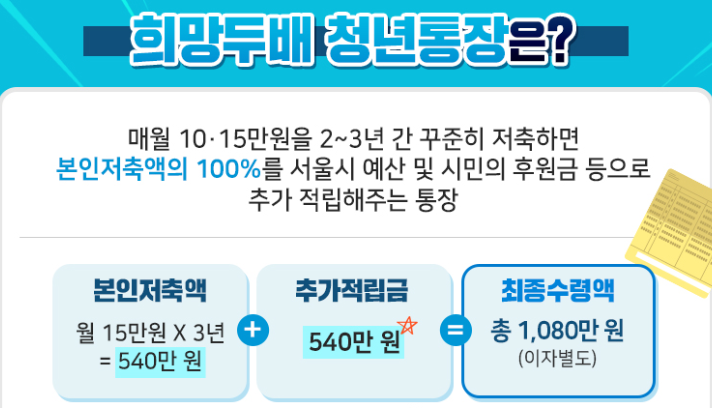 매월 10만원 또는 15만원을 2~3년 동안 저축하면 본인이 저축한 금액의 100%를 서울시 예산으로 추가 적립해주는 통장으로 쉽게 말해 내가 저축한 것의 2배를 받아갈 수 있는 통장입니다.