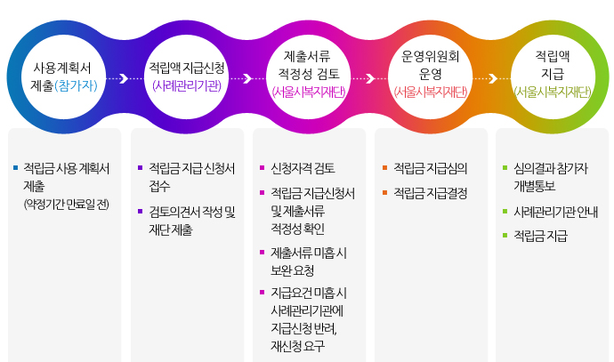 지급액은 다음과 같이 참가자가 사용계획서를 제출해서 적립액 지급신청을 하면 서울시 복지재단에서 서류를 검토하고 운영위원회에서 적립금을 지급할지에 대해 심의를 걸쳐 결정을 하게 됩니다. 그리고 나서 참가자에게 지급액이 지급되게 됩니다.