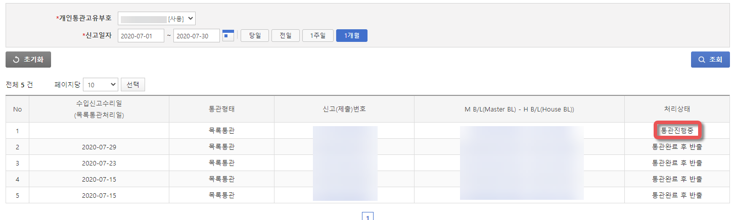 인증 후 다음과 같이 기간을 정해서 확인해보시면 1달 단위로 모든 결과를 확인하실 수 있습니다. 보통 직구를 하시게 되면 아래와 같이 목록통관 형태를 거치게 되고 처리가 완료되면 통관완료 후 반출 이라는 결과가 나타납니다. 반출 후 보통 다음날 또는 다다음날에 택배를 받아보시는 것이 일반적입니다.