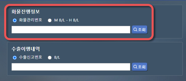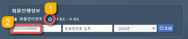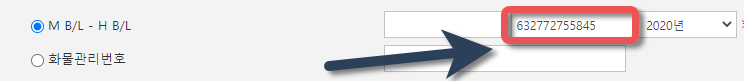 여기서 아래와 같이 'M B/L - H B/L' 이라는 것을 선택해주시고 아래에 이전에 확인하셨던 미등록운송장 번호를 입력해주신 후 조회 버튼을 눌러주시기 바랍니다.