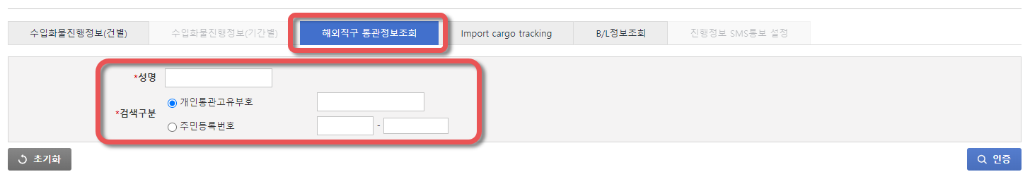 조금 전에는 수입화물진행정보(건별) 탭에서 확인했지만 전체 목록을 확인해보기 위해서는 가운데에 있는 '해외직구 통관정보조회'로 들어가주신 후 성명과 개인통관고유부호 또는 주민등록번호를 입력하셔서 아래와 같이 인증하시고 확인해보실 수 있습니다.