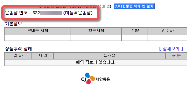 여기에 나와있는 운송장번호를 메모장에 적어두거나 사진을 촬영해두시면 나중에 택배 위치를 확인할 때 편리합니다. 참고로 드래그가 안되기 때문에 손으로 입력하셔야 합니다.