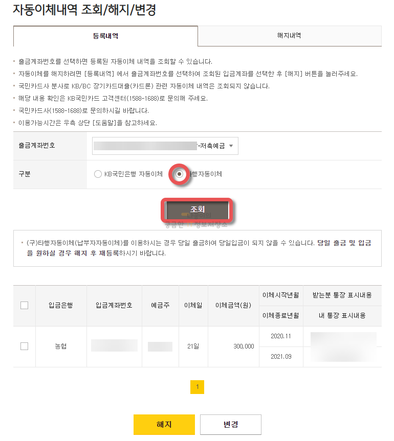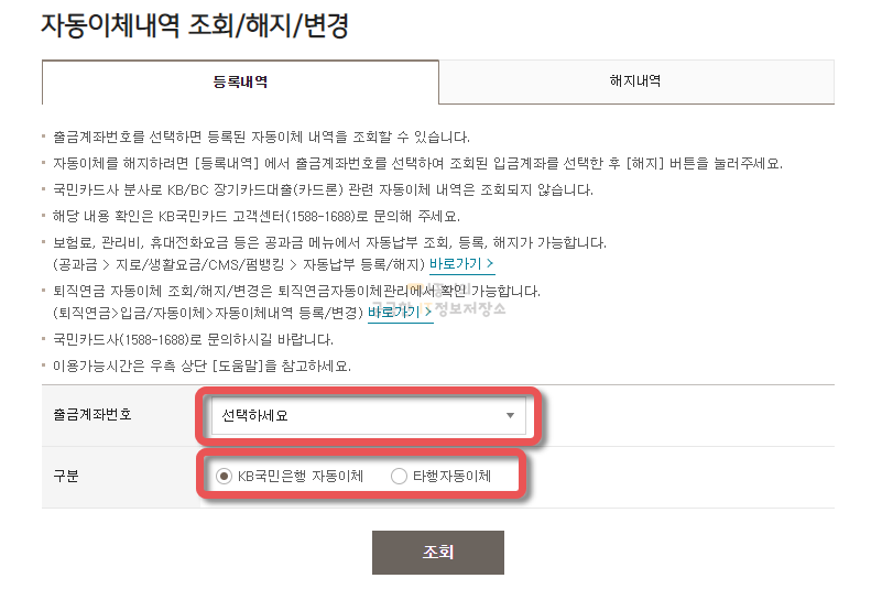 그럼 다음과 같이 등록내역을 조회하실 수 있는 페이지가 나오고, 출금계좌번호와 같은 은행인지 타행인지를 선택하고 조회 버튼을 눌러주시면 자동이체가 등록되어 있는 내역들이 나타나게 됩니다.