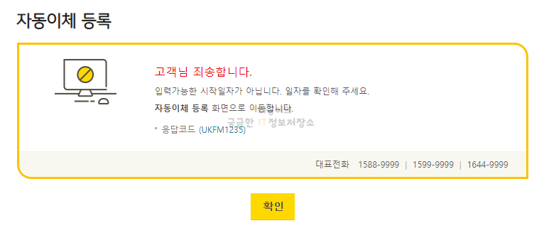그리고 이체일은 신청하는 다음날 부터 지정이 가능합니다. 저는 21일에 이체를 해야하는데 이체 신청한 날이 21일이라 마지막에 다음과 같은 메세지를 받게 되었습니다. 다시 처음부터 등록해야 하는 번거로움이 있었지만 이 글을 보신 분이라면 저같은 실수 없이 한 번에 등록하시길 바랍니다.