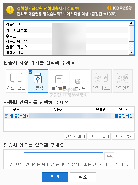 확인을 눌러주시면 마지막으로 공인인증서로 인증하면 자동이체 등록이 완료됩니다.
