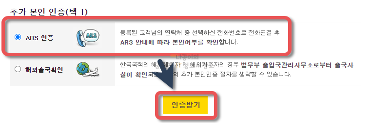 특별한 경우가 아니라면 ARS 인증을 선택하시고 인증받기를 클릭해주시면 되겠습니다.