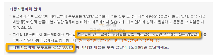 참고로 자동이체의 경우 다음과 같이 지정일이 휴일인 경우에는 다음 영업일에 이체가 되며, 타행의 경우에는 소정의 수수료가 발생할 수 있으니 참고해주시기 바랍니다.