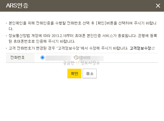 그러면 다음과 같은 인증창이 나타나고 원하는 전화번호를 선택하신 후 확인을 눌러주면 그 번호로 인증을 위한 전화가 옵니다.