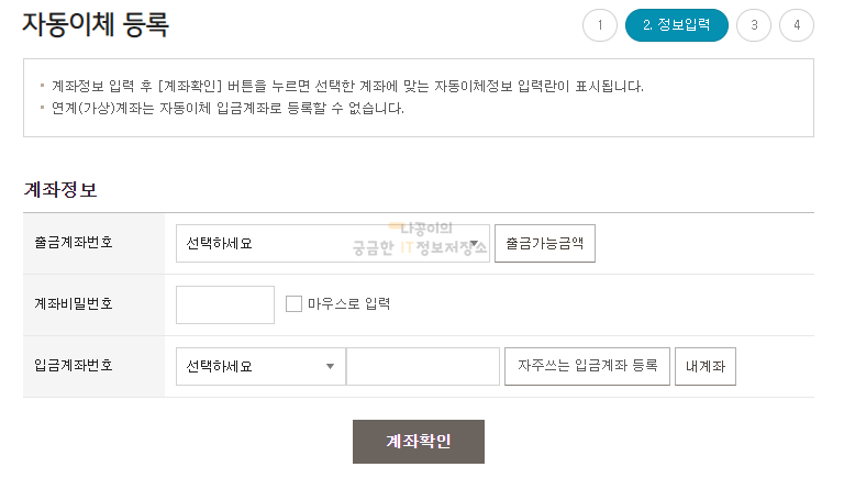 약관 동의 후 다음과 같이 출금 계좌번호를 선택하시고 비밀번호와 입금할 계좌를 적으신 후, '계좌확인' 버튼을 클릭해주시기 바랍니다.