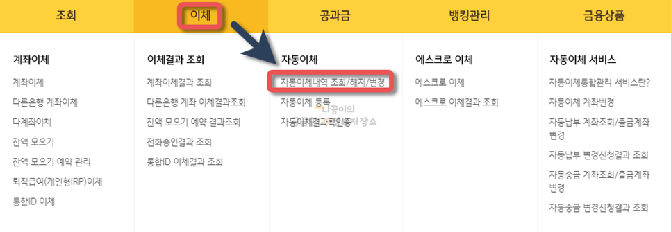 우선 다시 은행 홈페이지 첫화면으로 돌아가서 이체 메뉴의 '자동이체내역 조회/해지/변경'을 클릭해줍니다.
