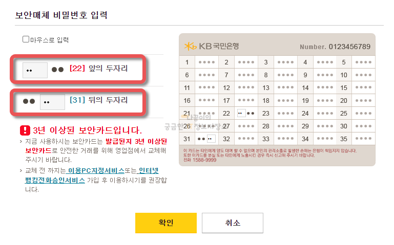 그 다음에는 보안카드 번호를 입력하는 창이 나오고 보안카드를 꺼내셔서 알맞은 숫자를 입력해주시고 확인을 눌러줍니다. 참고로 저도 몰랐었는데 보안카드는 3년 주기로 교체를 해줘야 하는 것 같습니다. 3년이 지났다고 교체를 해야한다고 하네요.