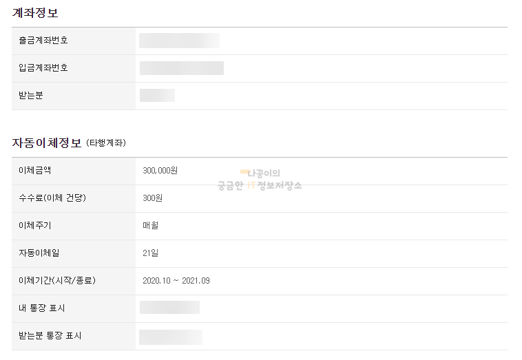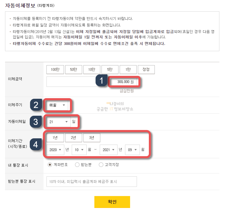 계좌확인 버튼을 클릭하시면 아래처럼 자동이체 금액과 주기, 이체일 등을 설정하는 화면이 나오게 됩니다.