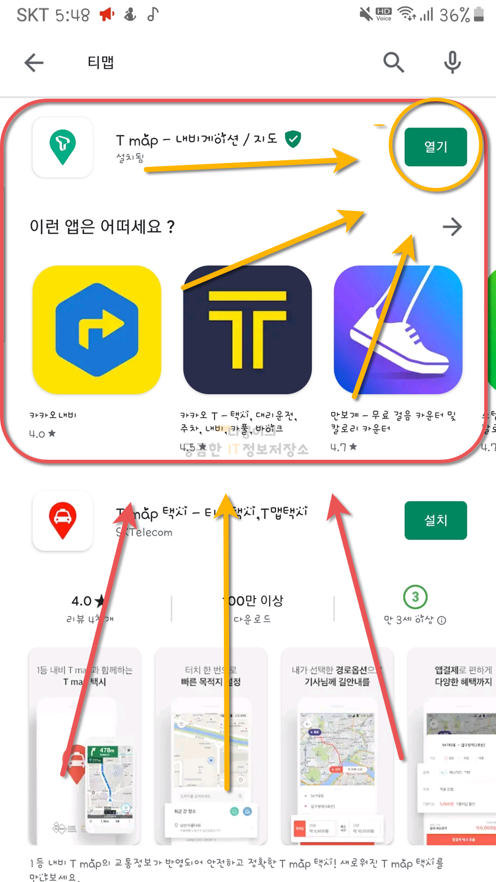 아래와 같이 티맵을 검색해서 설치 후 열기를 클릭해주시고 앱 사용을 위한 권한을 허용합니다.