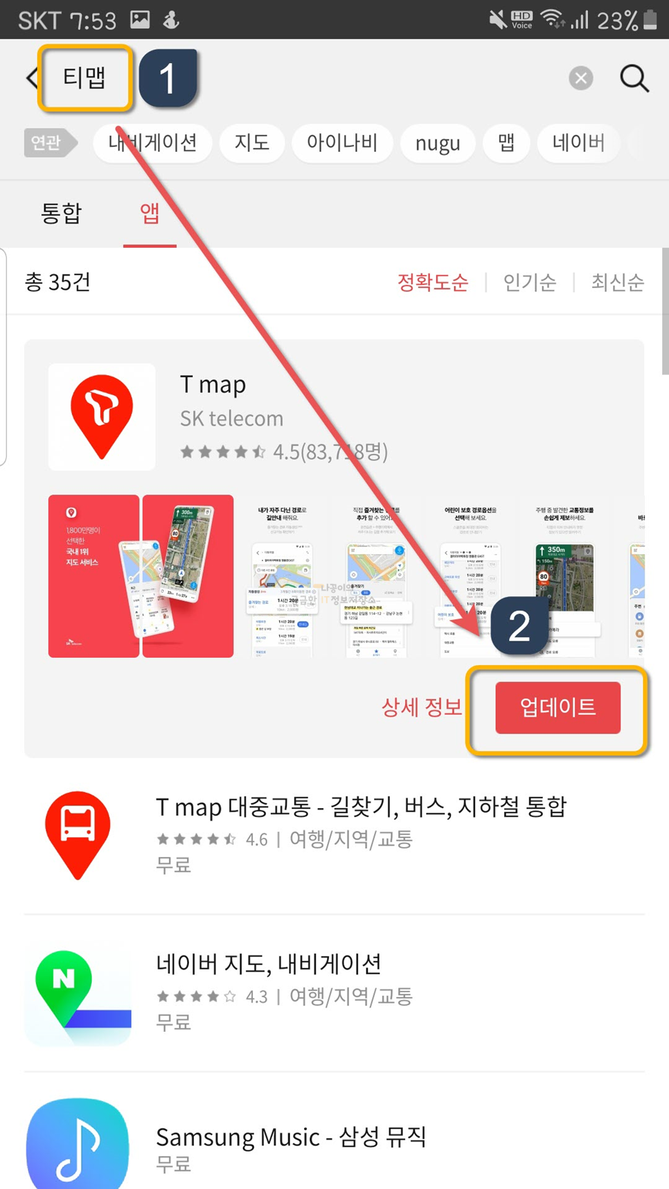 SKT고객이 사용하는 티맵의 경우에는 플레이스토어에서 업데이트가 불가능합니다.